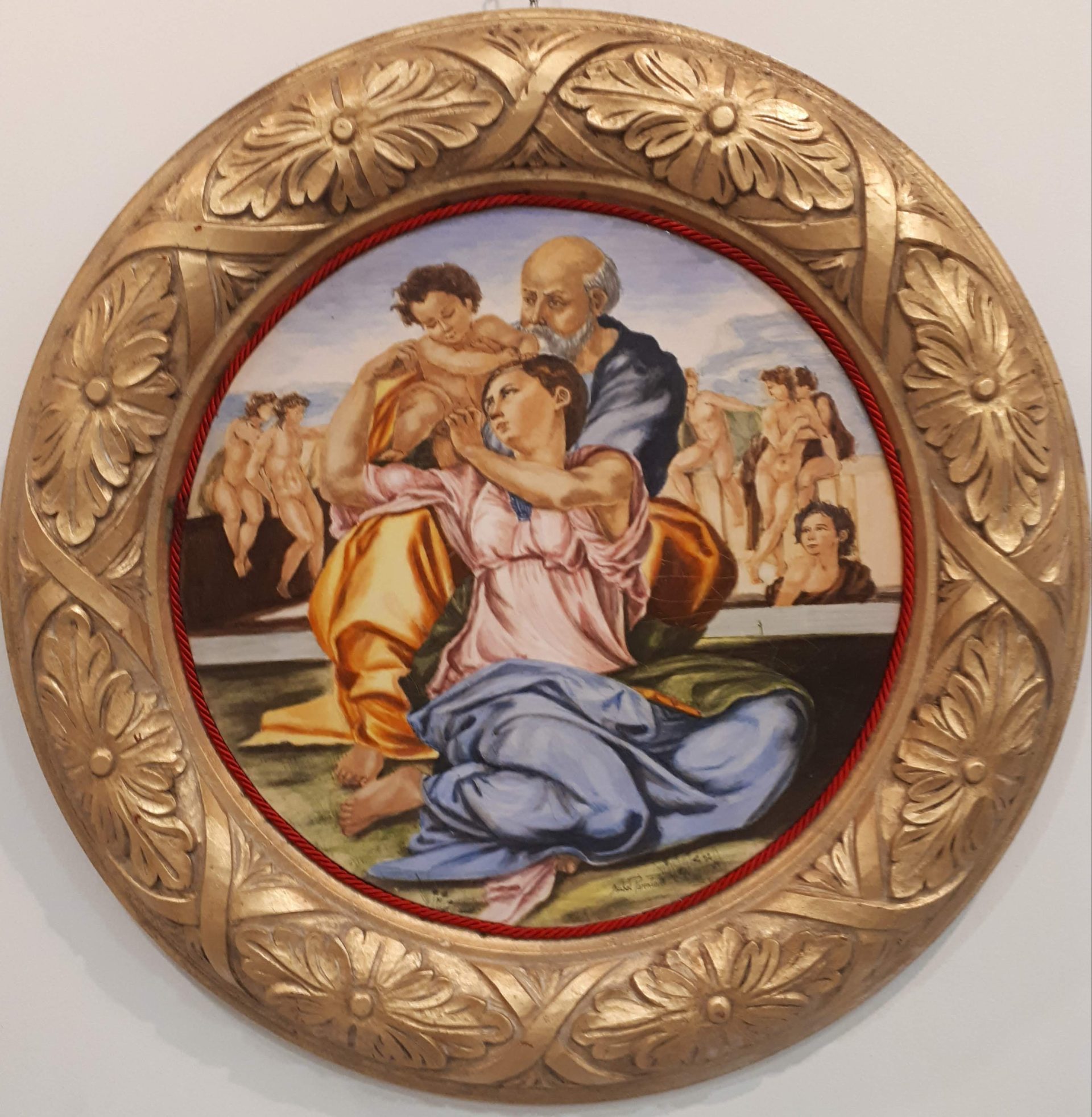 Pintura cerámica circular enmarcada en un aro dorado, inspirada en el clasicismo renacentista. Representa a la Sagrada Familia con el Niño, San José y la Virgen María, rodeados de figuras en segundo plano. Una obra de carácter artístico y devocional, ideal para espacios interiores.