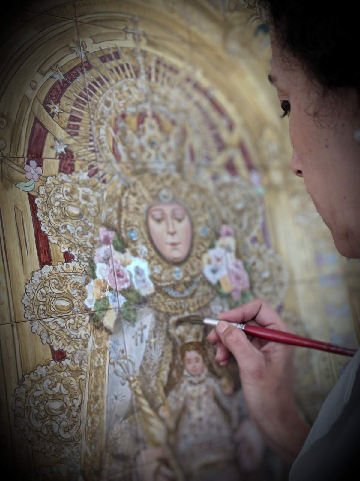 Proceso de elaboración de un retablo cerámico devocional dedicado a la Virgen con el Niño. La imagen muestra a la artista pintando a mano los detalles de la corona, las flores y los ornamentos dorados, reflejando la precisión y el carácter artesanal de la obra.