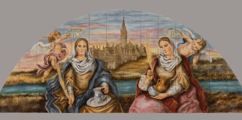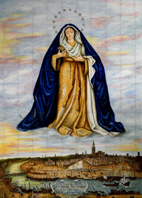 Retablo cerámico devocional que representa a la Virgen vestida con túnica dorada y manto azul, rodeada de un halo de estrellas. La escena se sitúa sobre una panorámica histórica de Sevilla con el río y la Giralda al fondo, transmitiendo un mensaje espiritual y patrimonial.