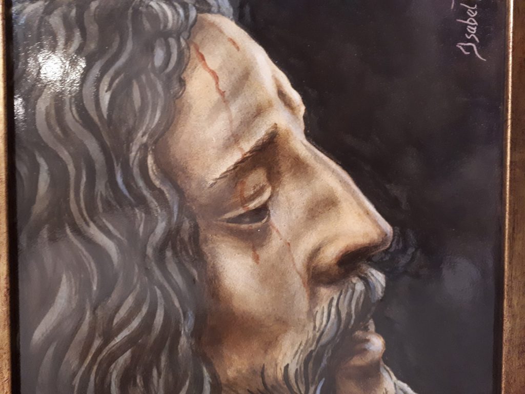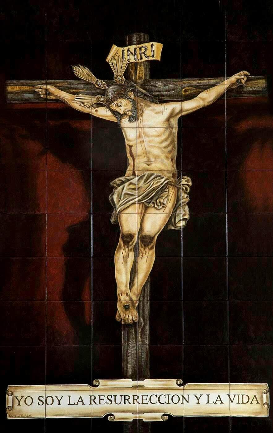 Retablo cerámico que representa a Cristo crucificado bajo el rótulo “INRI”. La obra muestra gran realismo en la expresión de dolor y recogimiento, acompañado de la inscripción “Yo soy la resurrección y la vida”, transmitiendo un mensaje de fe y esperanza.