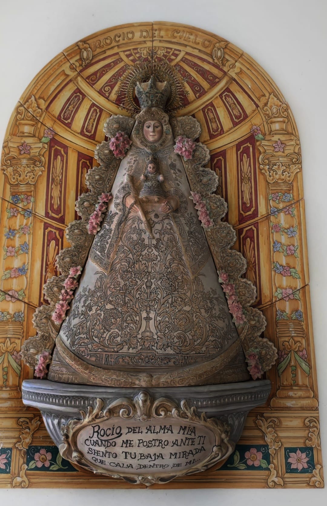Retablo cerámico de la Virgen del Rocío con el Niño, enmarcado por un arco dorado con decoración floral y arquitectónica. La pieza destaca por el relieve en el vestido y la inscripción devocional: “Rocío del alma mía, cuando me postro ante ti, siento tu baja mirada que cala dentro de mí”. Una obra que une fe y arte en una misma creación.