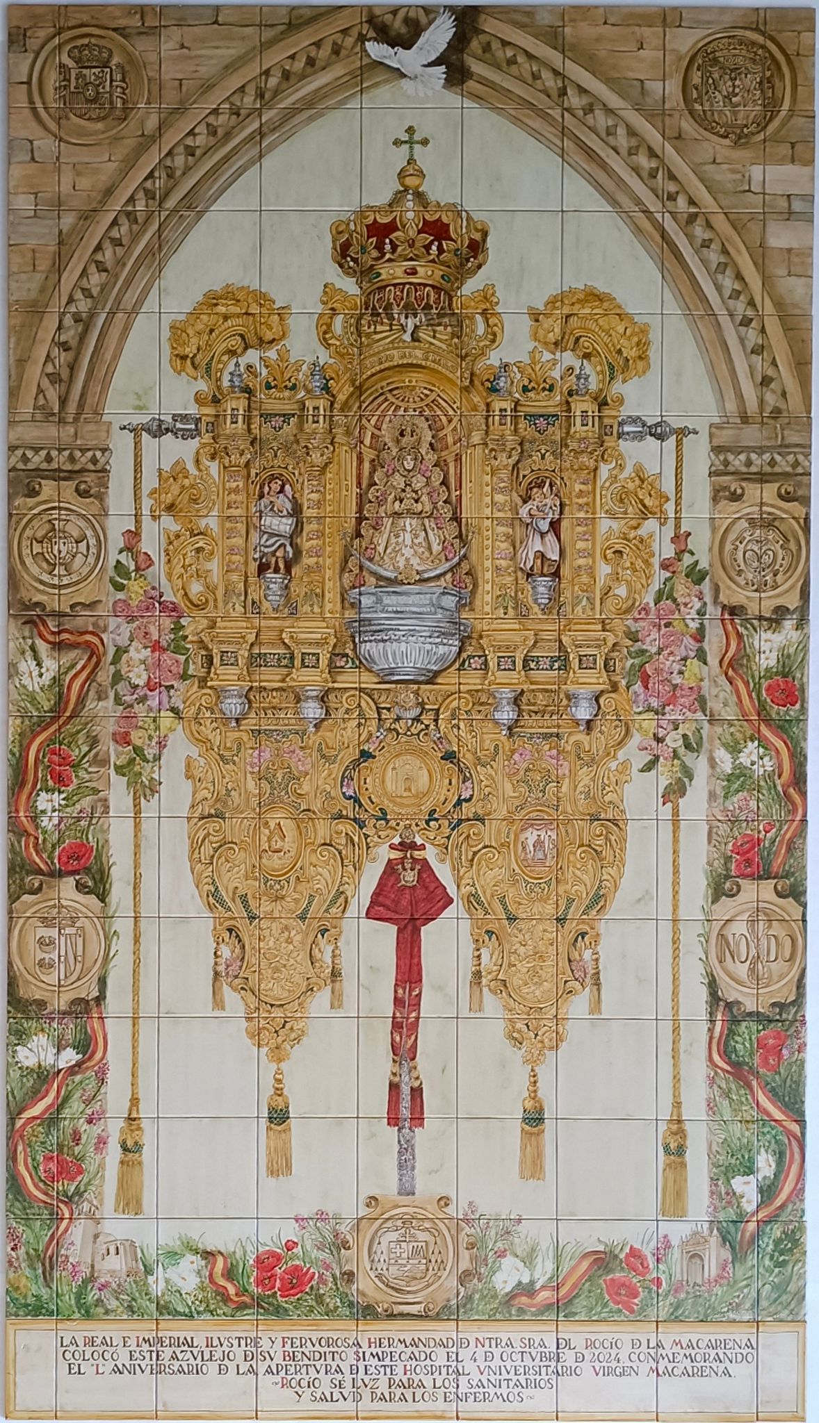 Retablo cerámico conmemorativo dedicado a la Virgen del Rocío, presentado en un rico templete dorado de estilo barroco, rodeado de motivos florales y escudos. En la parte inferior aparece una inscripción que celebra el aniversario de la apertura del Hospital Universitario Virgen Macarena, simbolizando fe, gratitud y protección para los enfermos.